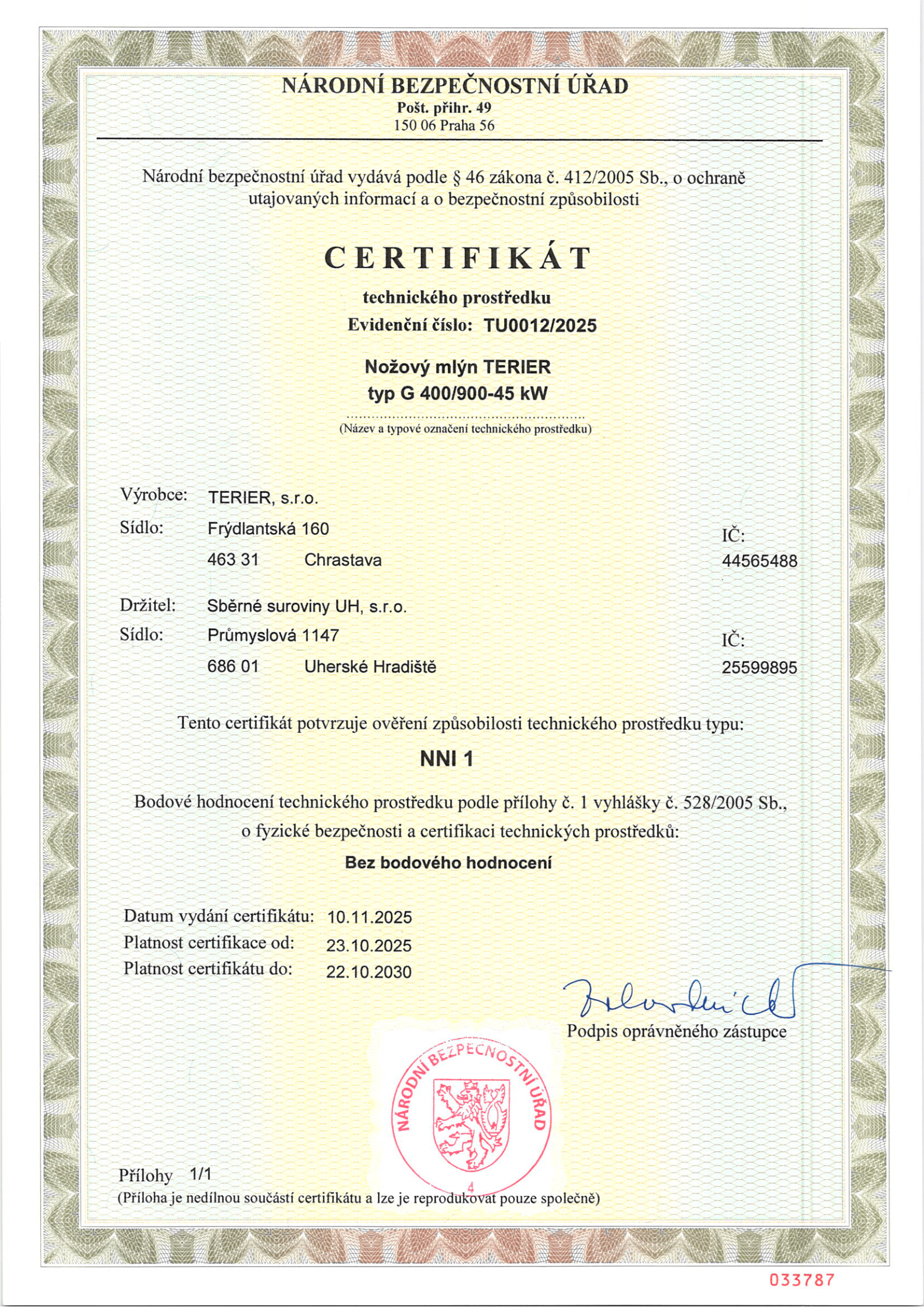 Poskytujeme službu skartace dokumentů drtící linkou pro skartaci citlivých informací, která je certifikována Národním bezpečnostním úřadem pro stupeň utajení 2.